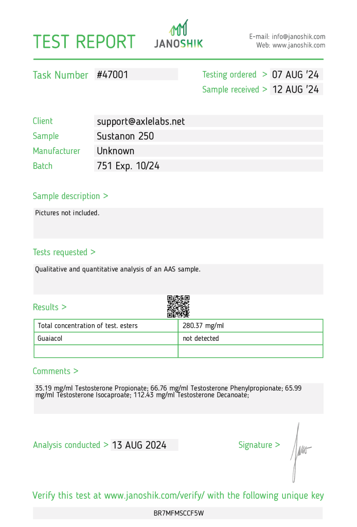 The product Sustanon 250, submitted by Axle Labs, underwent independent testing to verify its authenticity and potency. The manufacturer details were not provided, and the sample was identified by batch number 751 Exp. 10/24. The sample was analyzed by Janoshik Analytical, a laboratory specializing in pharmaceutical quality control, and tested for the presence of various testosterone esters and Guaiacol.