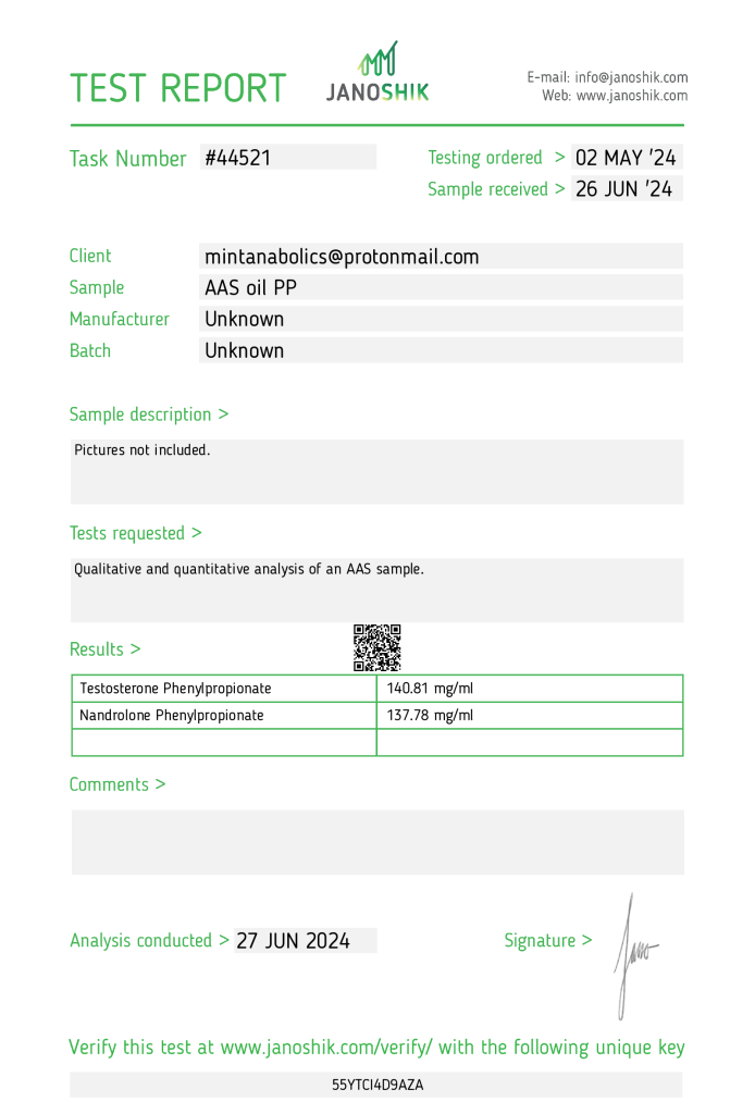 The product AAS oil PP, submitted for analysis by Mint Anabolics, underwent independent testing to verify its composition and potency. The sample was analyzed by Janoshik Analytical, a laboratory specializing in pharmaceutical quality control. The test confirmed the presence of Testosterone Phenylpropionate at 140.81 mg/ml and Nandrolone Phenylpropionate at 137.78 mg/ml.
