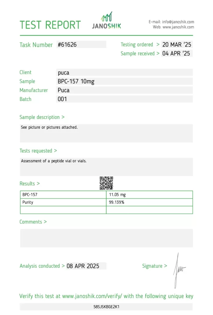 A sample of BPC-157 (10mg), manufactured by PUCA, was submitted for testing and verification. Both the submission and the funding of this analysis were carried out by the manufacturer (PUCA). Testing was performed by Janoshik Analytical, a laboratory known for its expertise in peptide and pharmaceutical testing.