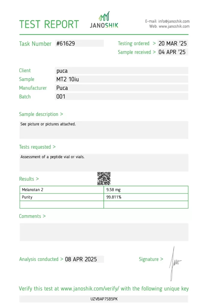A vial of Melanotan 2 (MT2) 10iu, manufactured by PUCA, was submitted for analytical testing. Both the submission and funding were conducted by PUCA (Manufacturer). The peptide was assessed by Janoshik Analytical, a third-party lab with expertise in verifying peptide identity and purity.