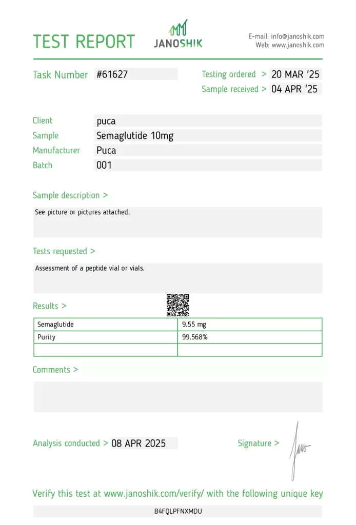 A sample of Semaglutide 10mg, manufactured by PUCA, was submitted by the manufacturer and tested to assess active ingredient content and purity. The test was conducted by Janoshik Analytical, a third-party lab known for its rigorous peptide verification procedures.