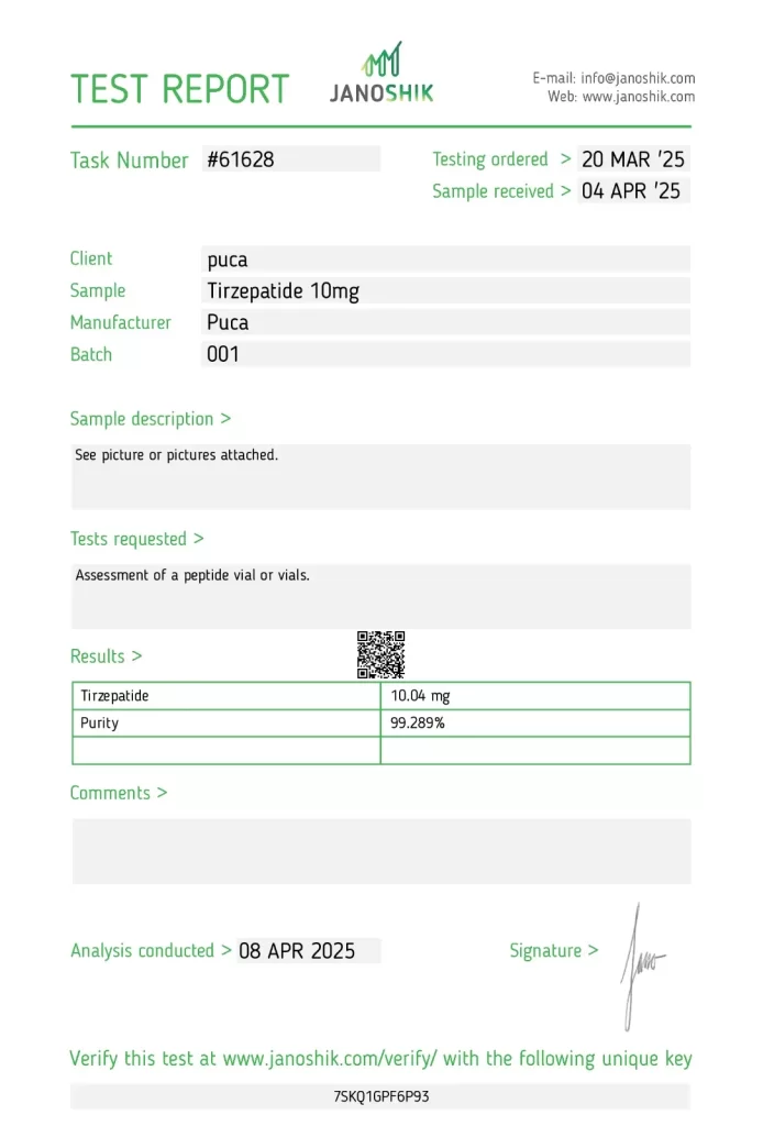 A vial of Tirzepatide (10mg), manufactured by PUCA, was submitted by the manufacturer itself for testing and verification. The analysis was both submitted and funded by PUCA, reflecting a proactive quality control measure by the producer. Testing was carried out by Janoshik Analytical, a laboratory recognized for its pharmaceutical and peptide validation services.