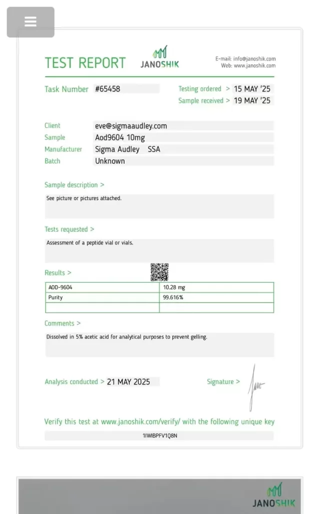 A sample of AOD-9604 peptide (10mg), produced by Sigma Audley SSA, underwent chemical composition analysis by Janoshik Analytical, an independent pharmaceutical testing laboratory. The sample was submitted and paid for by the manufacturer, Sigma Audley.